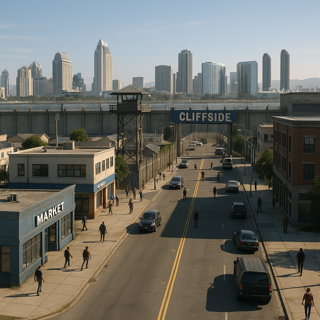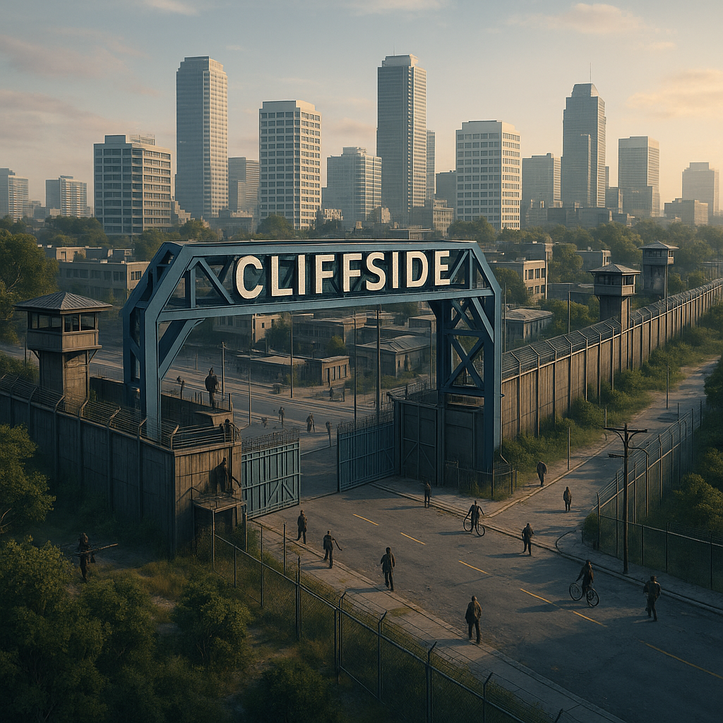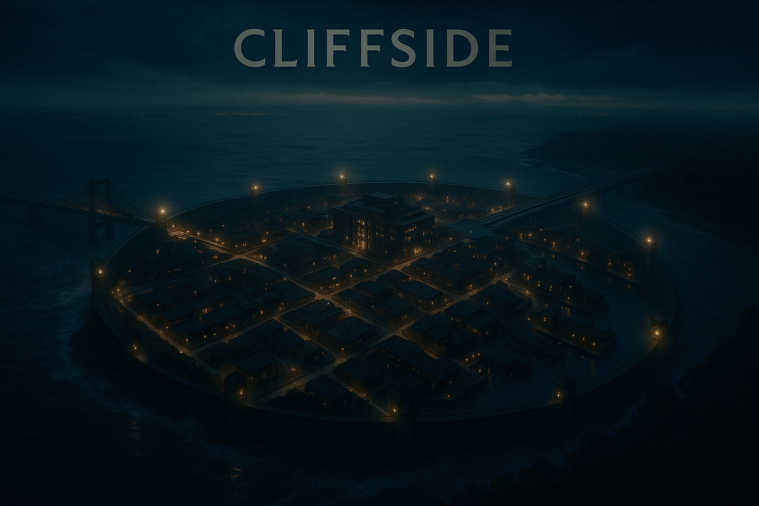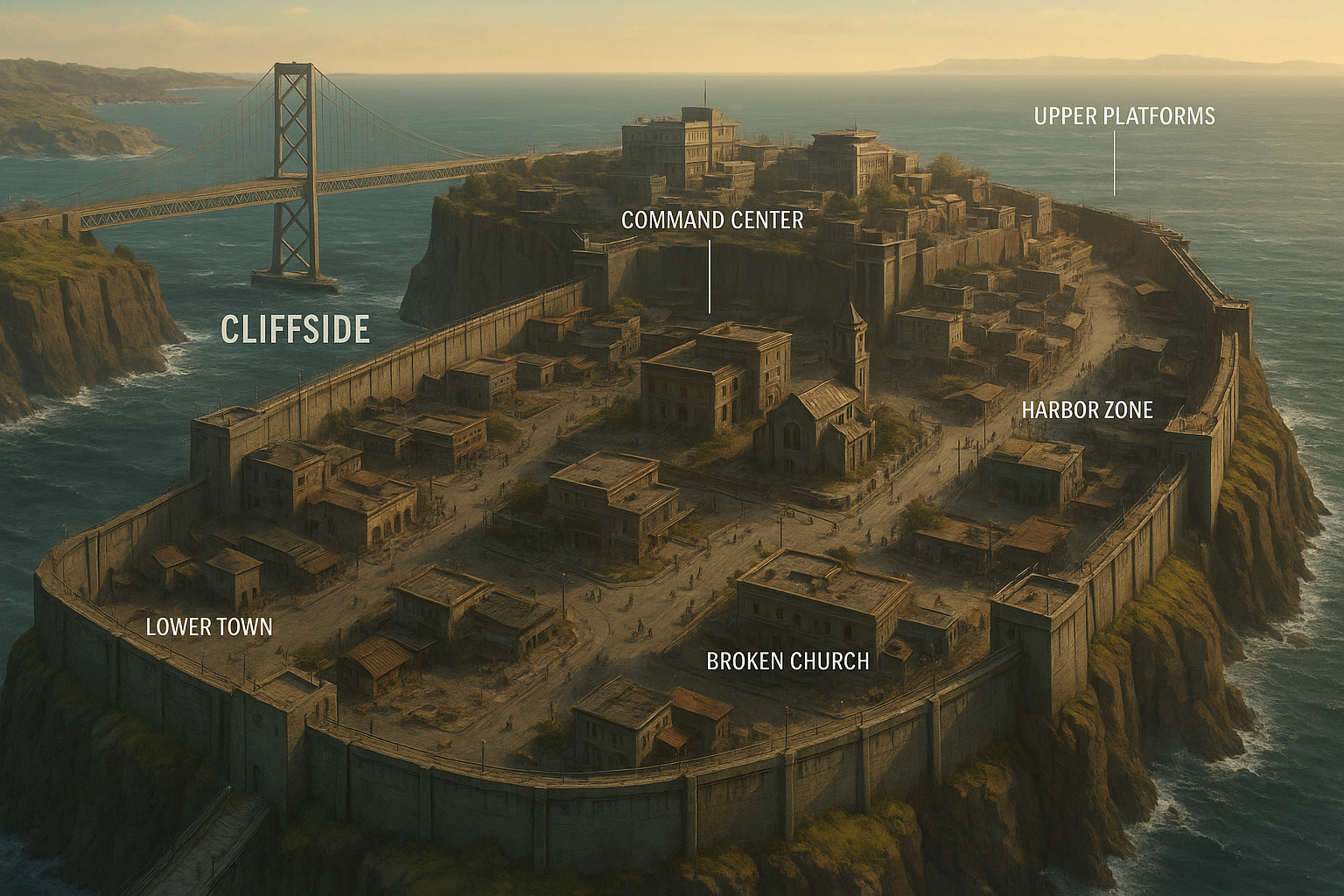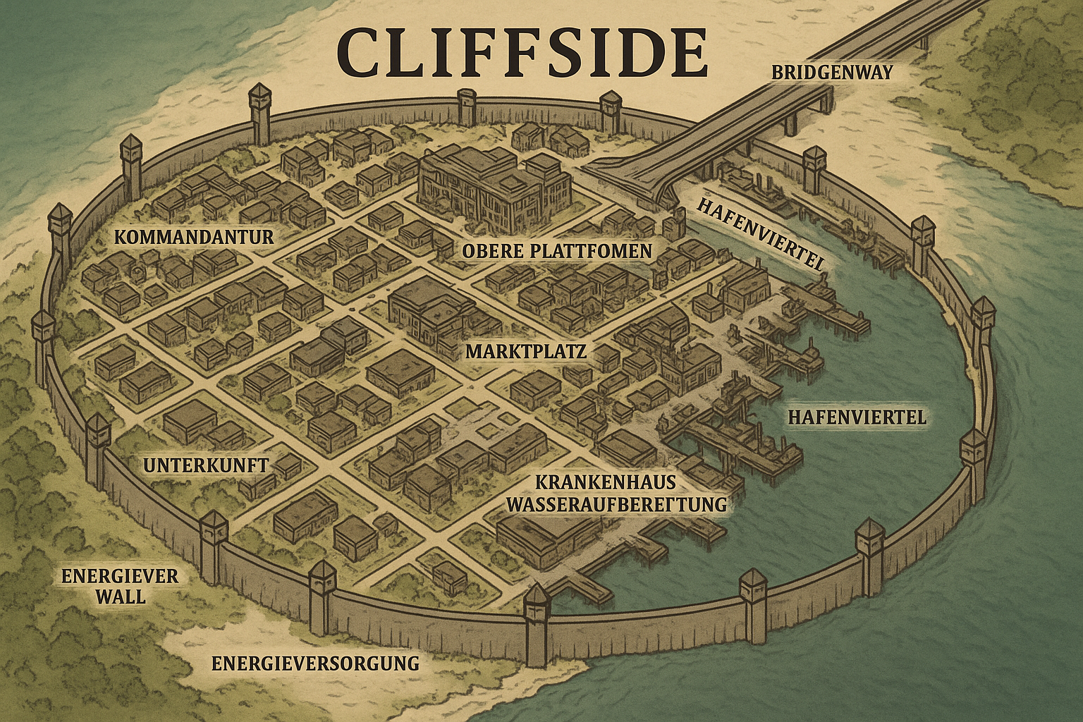 Cliffside – Die Stadt an den KlippenSie fiel. Sie schwieg. Und sie steht wieder. Überblick: Die Welt von Cliffside![]() ![]() Cliffside – Ort & AtmosphäreGeographische LageCliffside liegt an der zerklüfteten Westküste des alten Kaliforniens, dort, wo der Pazifik gegen Beton und Stahl brandet. Einst ein beschaulicher Vorort von San Diego, heute eine der letzten funktionierenden Siedlungen der westlichen Hemisphäre. Die Stadt ruht auf einem Hochplateau über dem Meer, geschützt durch massive Sicherheitszäune und Brücken, die nach dem Zusammenbruch erneuert wurden. HintergrundVor fast zehn Jahren fiel Cliffside. Doch die Apokalypse kam nicht mit Feuer oder Krieg – sie kam leise. Drei Jahre ist es her, seit die Welt endgültig verstummte. Von den einst 8 Milliarden Menschen blieben nur 24 Millionen übrig, verstreut in verlassenen Städten und improvisierten Enklaven. Cliffside hat überlebt – oder wurde am Leben gehalten. Landschaft & AtmosphäreZwischen den Klippen ragen alte Wohnkomplexe wie Betonruinen aus der Erde. Rost, Salz und Sturm prägen das Stadtbild. Im Zentrum: der alte Stadtkern mit der zerbrochenen Kirche und der wiederaufgebauten Kommandozentrale – ehemals das Rathaus. Nachts hört man das Meer tosen und das ferne Surren der Generatoren, die Cliffside mit Strom versorgen. Es ist kein Ort des Friedens. Aber ein Ort des Überlebens. KlimaFrühling: feucht und windig; Nebel zieht vom Meer herein, legt sich auf die Brücken und die alten Türme. Sommer: trocken, glühend heiß auf den oberen Ebenen, kühl und salzig in den Tunneln unter der Stadt. Herbst: stürmisch; Regen peitscht gegen die Betonwände, während das Meer anschwillt. Winter: nass, von kaltem Wind getrieben; in den Nächten gefriert das Meer an den Felskanten. Stimmung & MythosCliffside fühlt sich lebendig an – zu lebendig. Die Menschen arbeiten, tauschen, bauen. Doch es gibt Dinge, die man nicht hinterfragt: Den Nachtwächter, der nie blinzelt. Die Krankenschwester, deren Schatten sich eigenständig bewegt. Den Bürgermeister, der seit drei Jahren nicht gealtert ist. Und die Kinder, die von Dingen reden, die sie nicht wissen können. Niemand spricht darüber. In Cliffside gilt nur eine Regel: Wer redet, verschwindet. Struktur & Aufbau![]() Bild 1: Zonen – Brückensektor, Hafenviertel, obere Plattformen